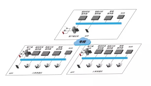 系统支持多级组织架构和分布式部署。按照使用场所、卡口数量、 测温目标数量的不同,可采取不同部署模式。在具体应用中,对于监狱大门、办公楼、监狱医院、监狱超市等出入口,可设置单点式布控,用体温检测设备,对出入人员进行非接触式筛查;对监狱厂房、监舍多个人行通道口或监狱范围内有多个人行出入口的,可设置联网式布控,通过固定点位安装的方式,将多个体温检测装备联网,在 中心实现对监测区域内的全局监测,避免造成交叉感染。